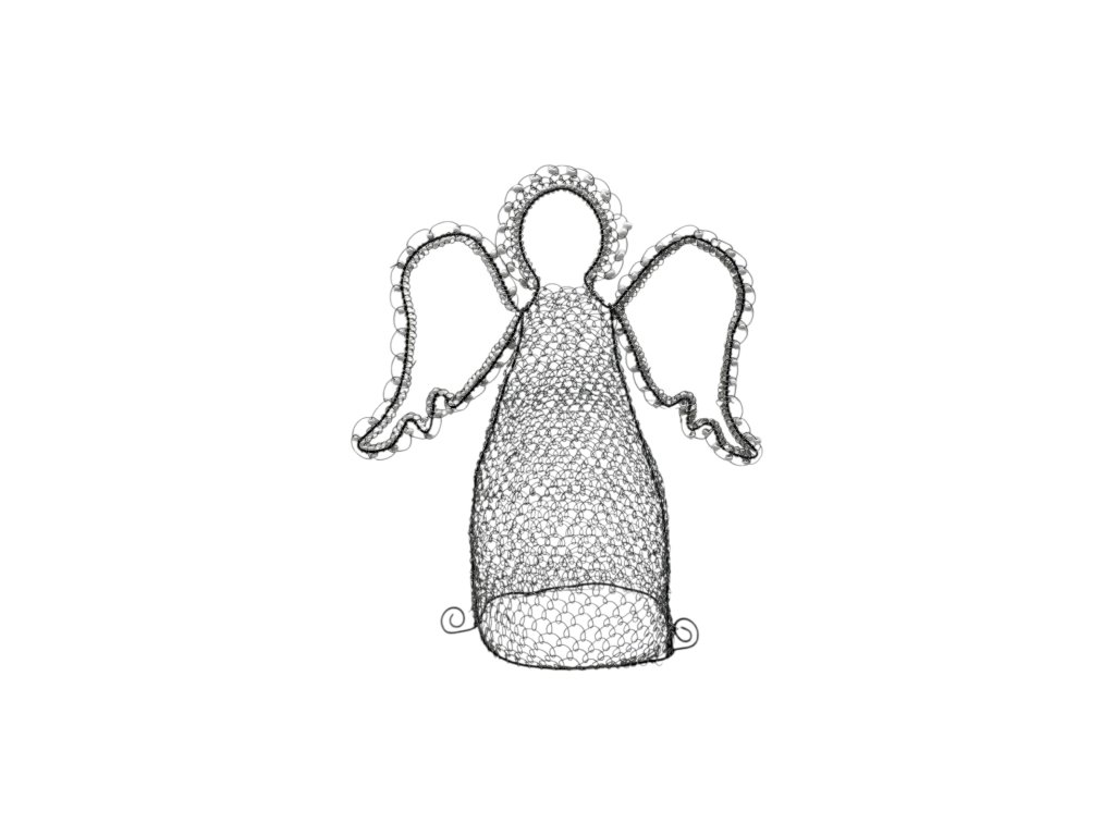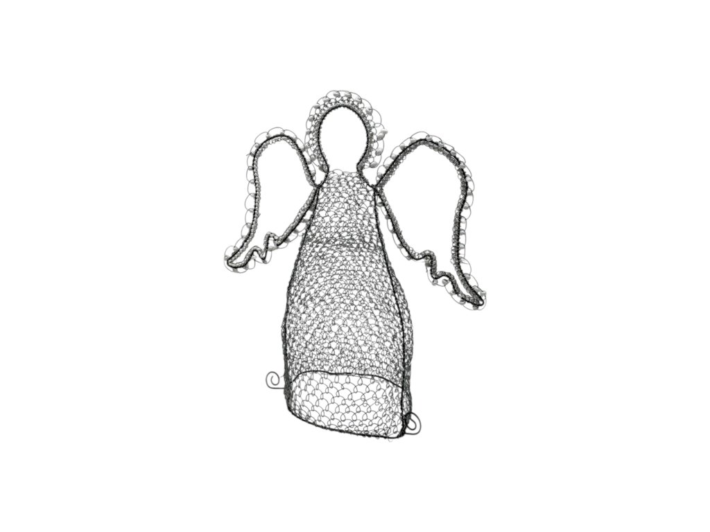 Každá jeho část je pečlivě tvarovaná do jemné drátěné krajky, která působí lehce a étericky – jako by se anděl právě vznášel nad prostorem, který má chránit.