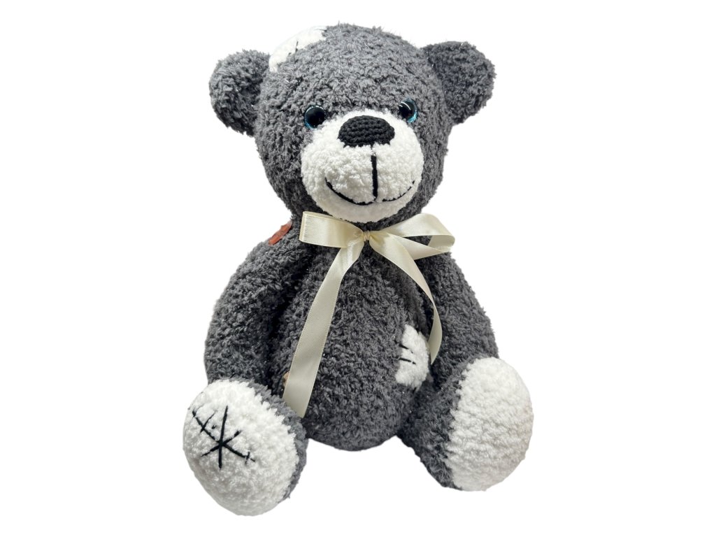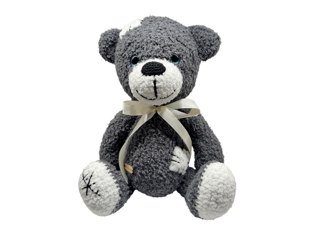 Ručně háčkovaný medvídek Kubíček v elegantní kombinaci šedé a bílé působí jemně, klidně a hřejivě. Vyrobený s láskou českými seniorkami z hebké příze s lehkým třpytem přináší do domova útulnost i radost.