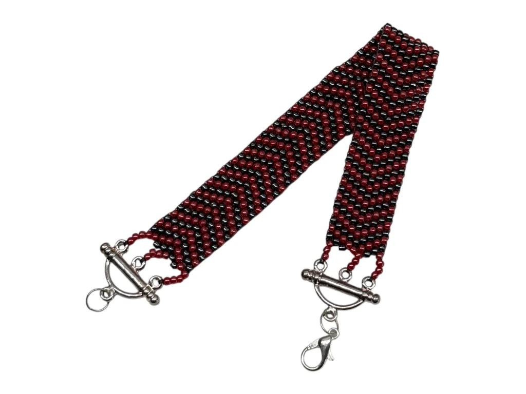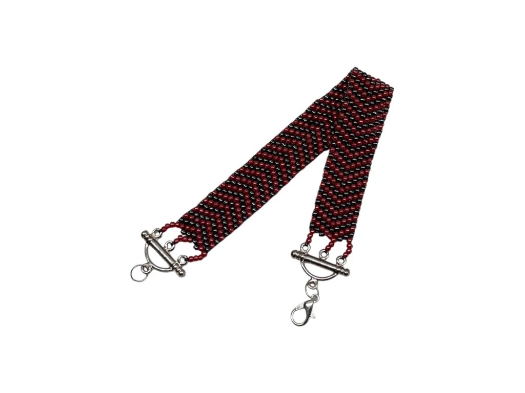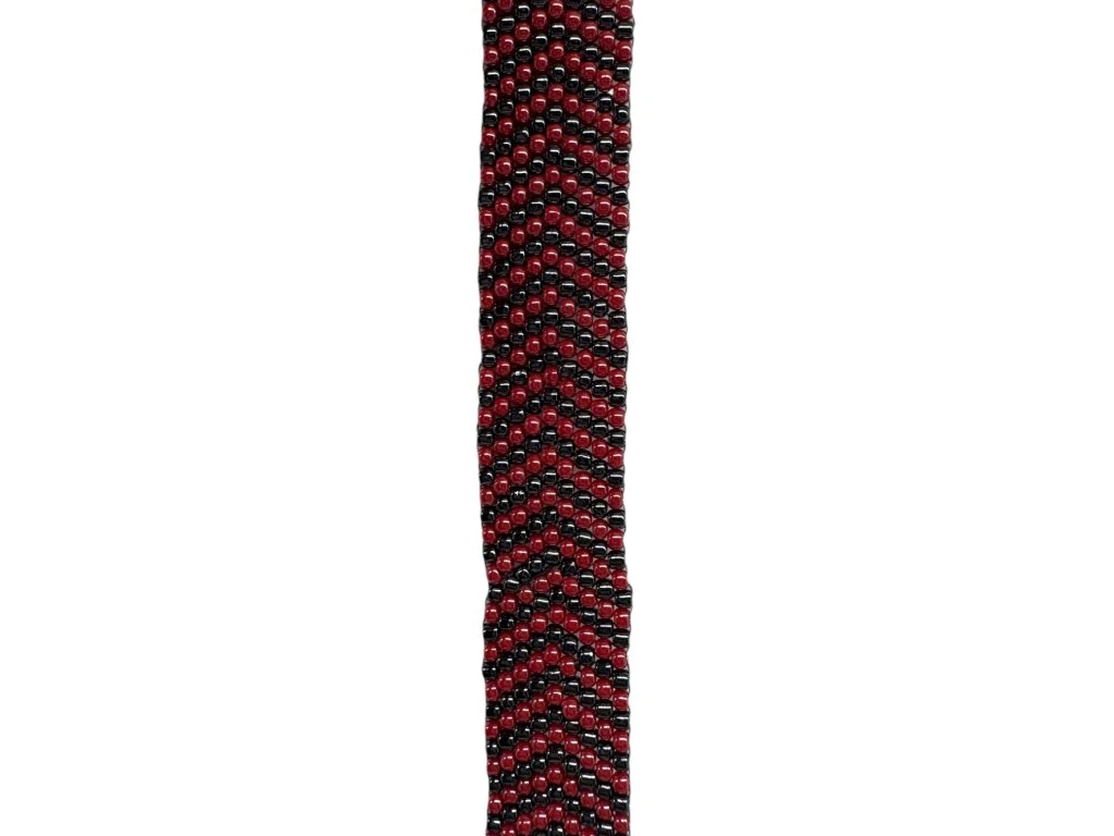 Tento originální korálkový náramek je ukázkou precizní ruční práce a trpělivosti. Každý korálek je pečlivě navléknutý českými seniory, kteří do tvorby vkládají své zkušenosti, čas i radost z poctivého řemesla. Kombinace sytě červených a černých korálků vytváří výrazný, elegantní vzor, který působí nadčasově a stylově.