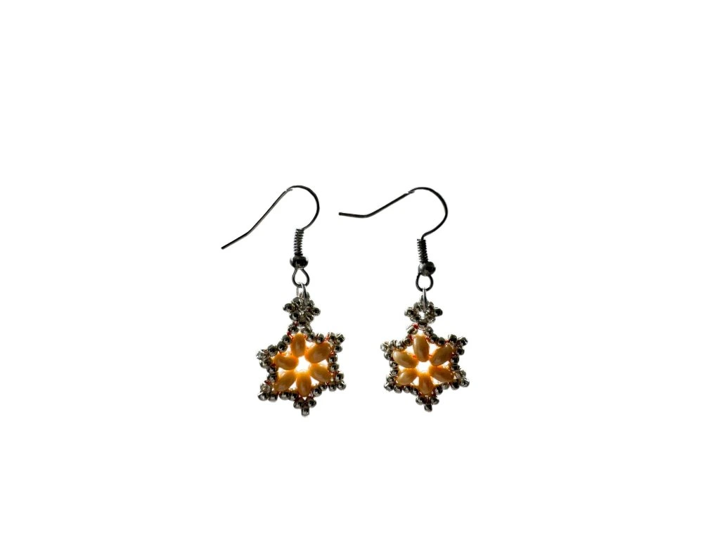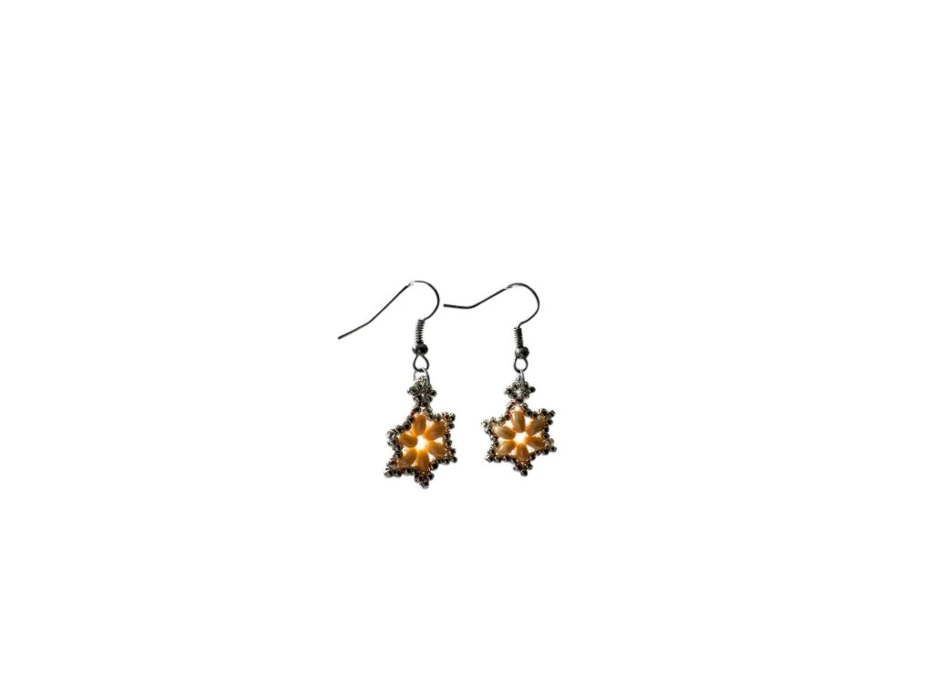 Tyto ručně vyráběné náušnice zaujmou svou něžnou elegancí a jemným květinovým motivem. Kombinace teplého zlatavě meruňkového tónu s kovovým lemováním vytváří harmonický šperk, který působí decentně, ale přesto originálně.