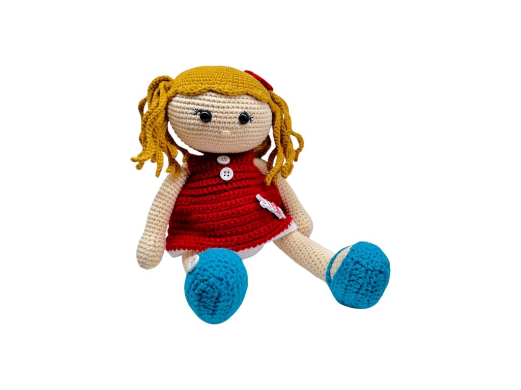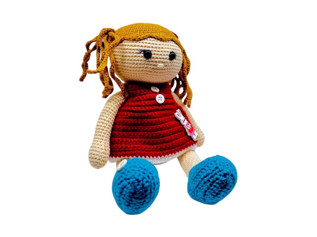 Alenka má krásné copánky, jemné detaily obličeje a háčkované oblečení, které působí hřejivě a nostalgicky — jako připomínka starých časů, kdy se věci tvořily pomalu, s láskou a hlavně pro radost. Je to malá společnice, která vnese do prostoru klid, útulno a dotek čisté, poctivé tvorby.