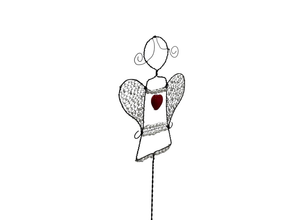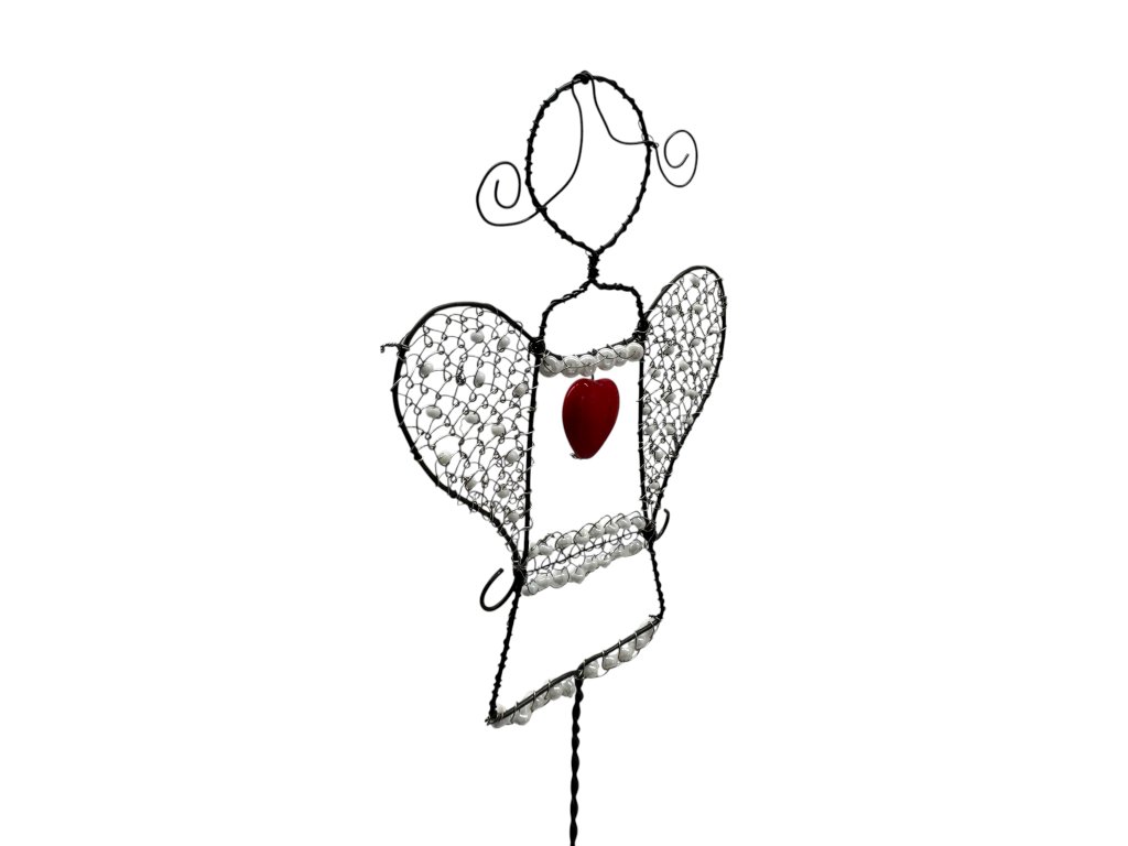 Tento ručně drátovaný anděl s červeným srdcem je něžným symbolem lásky, ochrany a klidu. Každý jeho detail – od jemně propletených křídel až po drobné korálky – vznikl s trpělivostí a pečlivostí, které mu dodávají jedinečný charakter a duši.